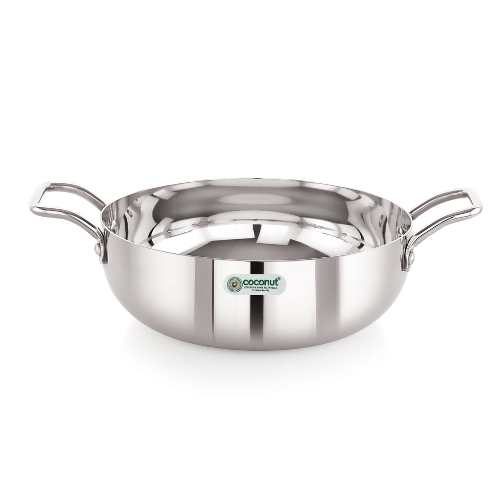 Coconut has introduced 18G Kadai. Kadai is crafted with Rust Free Stainless Steel. This Kadai has adds Style to your Kitchen to look more beautiful and well decorated. This Kadai with Lid can be used both on gas stoves as well as induction cooktop. This Kadai is multipurpose. One can cook Vegetable. Rust Free, Premium Quality Stainless steel of heavy gauge. This Kadai is strong, durable and convenient to clean and wash. Sure, to serve you well for a long time, this item is an ideal pick against your valuable currency. This Coconut stainless steel Kadai is Multipurpose as one can cook daal, paneer, Vegetable etc. One will love to cook and serve in this. Coconut is a top brand in Home and Kitchen essentials. Coconut stainless Steel Neutron Kadai wide size.