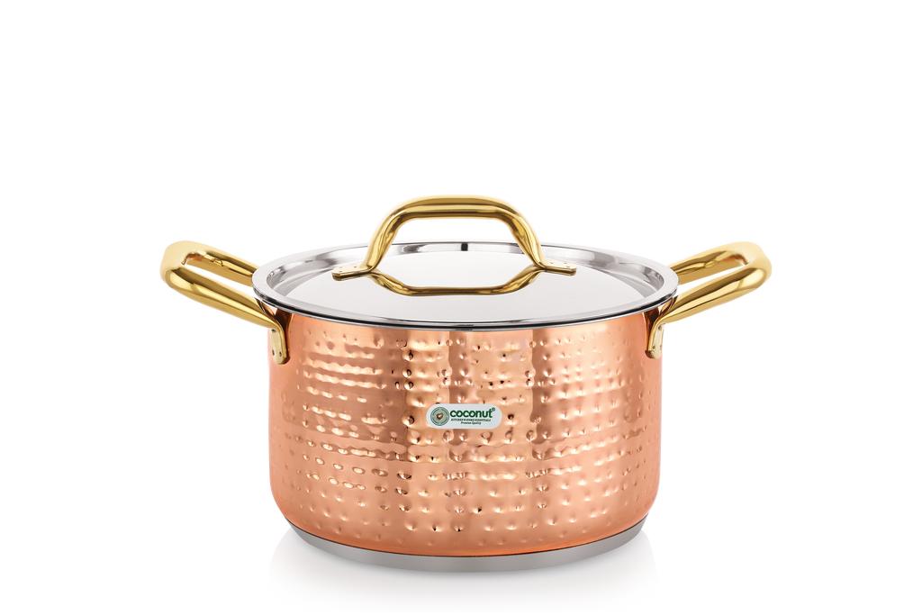 Coconut has introduced Copper Finish Hammered Design Capsulated Stockpot. Hammered Capsulated Stockpot is crafted with Rust Free Stainless Steel. This Stockpot has Copper Finish on the outisde with Hammered Design which adds Style to your Kitchen to look more beautiful and well decorated. This Stockpot with Lid can be used both on gas stoves as well as induction cooktop. This Stockpot is multipurpose. One can cook Vegetable. Rust Free, Premium Quality Stainless steel of heavy gauge. This Stockpot is strong, durable and convenient to clean and wash. Sure, to serve you well for a long time, this item is an ideal pick against your valuable currency. These Coconut stainless steel Copper Polish Hammered Design Stockpot is Multipurpose as one can cook daal, paneer, Vegetable etc. One will love to cook and serve in this. Coconut is a top brand in Home and Kitchen essentials. Coconut stainless Steel Serene Stockpot wide size. Product Dimensions -