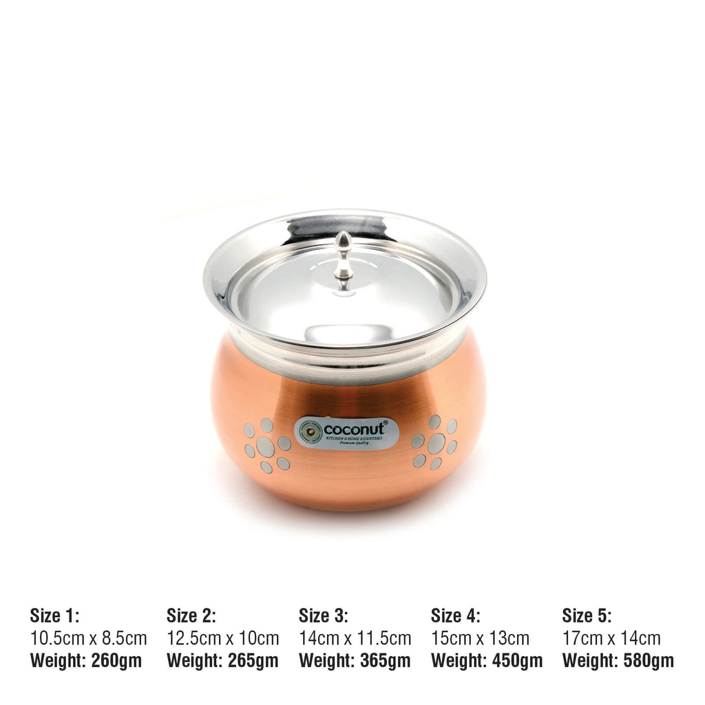 This Rex Handi is made from High Quality stainless steel, with heavy guage for High Durability. Rust proof and Food Grade steel. Induction and Gas Friendly. Compaq size makes it easy to store in kitchen cupboards. Easy to clean and maintain. When not in use, stack the smaller container inside bigger containers saving storage space. Ideal for daily use on your Gas Stove. Energy efficient. Heats evenly and cooks faster. Food will not stick to your pan. This Temple Handi comes with ( Without Handle & Lid).Product content: Coconut Stainless Steel Copper Rex Handi – 1 Unit.