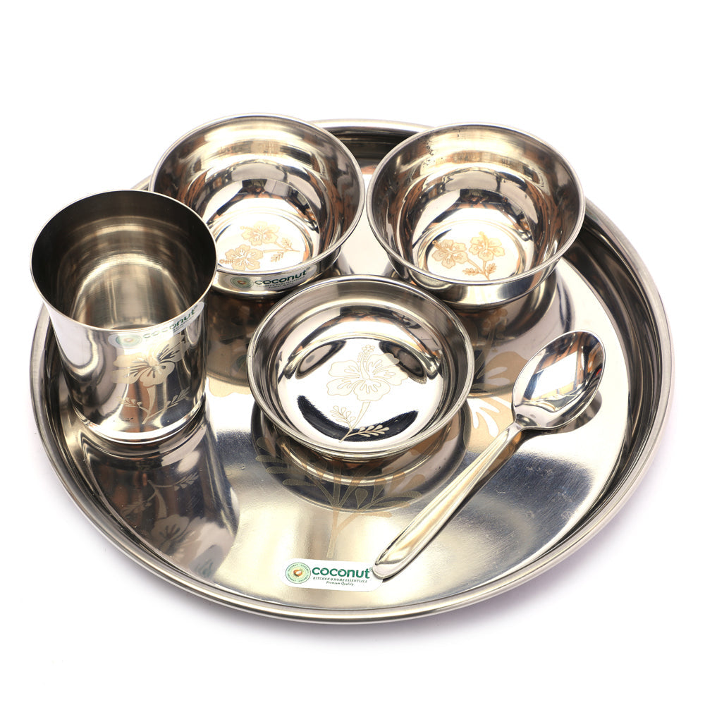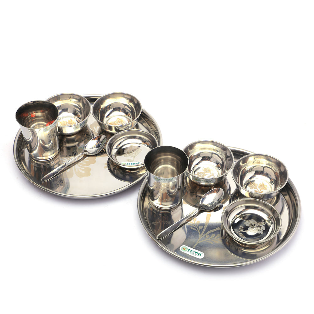• Coconut Stainless Steel Family Lunch Set/ Dinner Set - 12pc Set - Dimensions - Plate - Length - 29cm, Width - 29cm, Height - 3cm, Halwa Plate - Length - 10cm, Width- 10cm, Height - 2cm, Bowl - Length - 10cm, Width- 10cm, Height - 4cm, Glass - Length - 8cm, Width- 8cm, Height - 9.5cm, Spoon - Length - 15.5cm, Width- 5cm, Height - 1cm. Weight - 1285gm