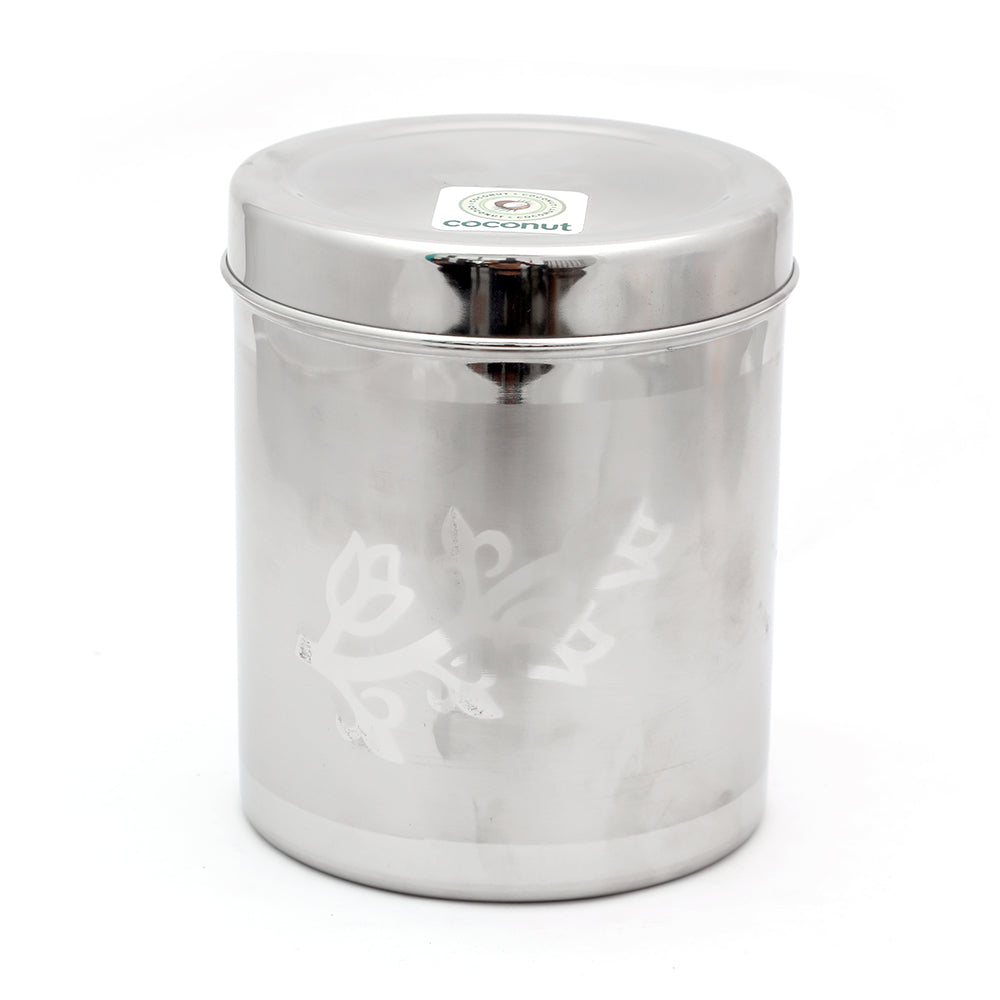 Crafted from High-Grade Stainless Steel which will not crack or rust. Container have enough Deep Space for storing Edibles, Grains, Snacks etc. Compaq size makes it easy to store in kitchen cupboards. Easy to clean and wash, they have very exotic silver shining. Product Content : Coconut Stainless Steel Flower Deep Dabba /Storage Container -