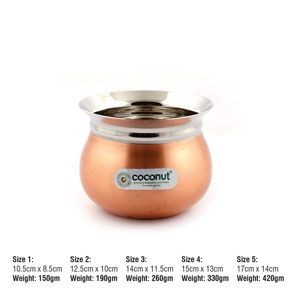 Coconut is range of Innovative and Quality products for Home and Kitchen. This Tomato FC Copper Handi is ideally used to Serve Food like Curries, Dals, Biryani and other Indian Dining Experience for Dinnerware products. The Stainless steel surface preserves the taste and nutritional qualities of foods and it is a Food Grade product. It is ideally used for Home, Restaurants, Bars and catering services, which comes with Inside Stainless steel & Outside Copper Based. Product content : Coconut Tomato FC Copper Handi Cookware – 1 Unit without Lid and Handle.