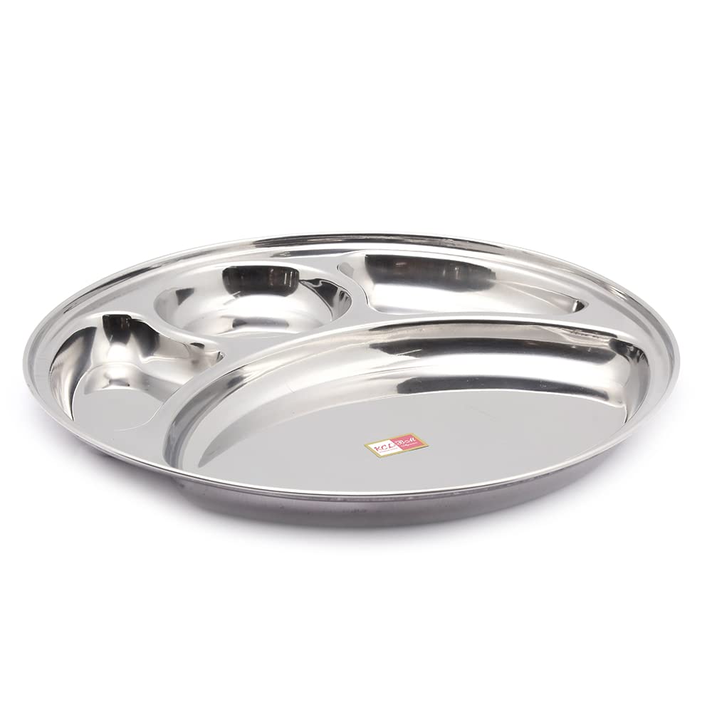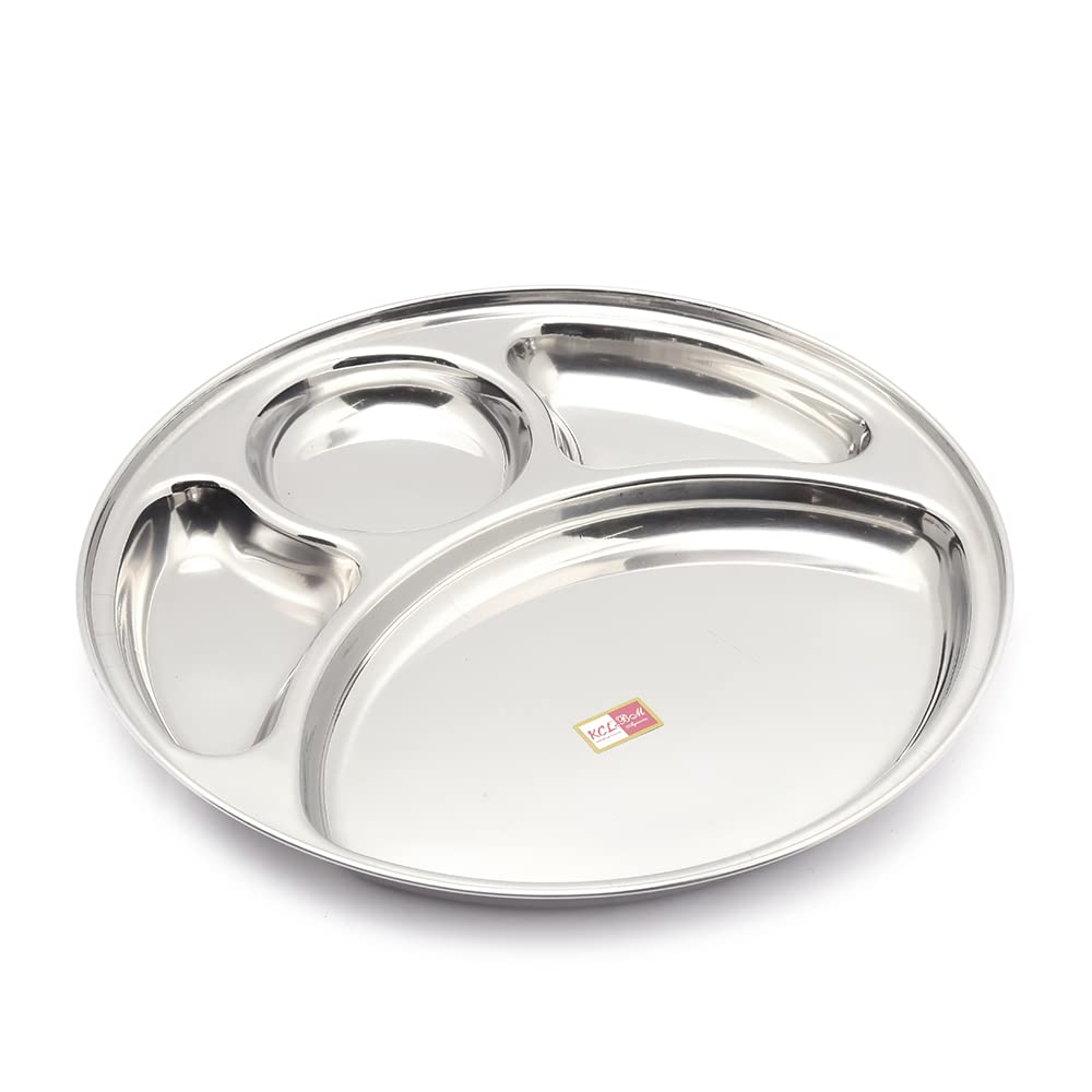 KCL Stainless Steel Round Partition Dinner Plate Set | 20 Gauge Heavy Steel Thali with 4 Compartments | Mirror Finish | Rust Proof & Dishwasher Safe | Pack of 6.